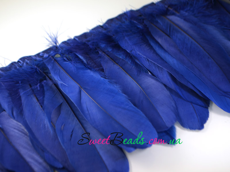 Пера гусячі-2, колір кобальт. Пришиті на стрічці, на клею. Довжина 15-20см, ширина від 2см до 3см приблизно. Розміри можуть змінюватись, так як природа - не завод:). Ціна вказана за 10 см стрічки. В 10см стрічки приблизно 7-8 пір'я. Можна використовувати стрічкою, а можна розрізати.