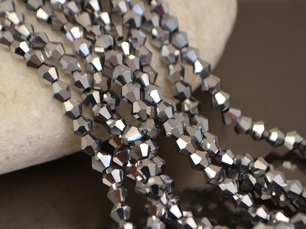 Біконуси кришталеві. Розмір 4 мм, колір срібло. У нитці 104 намистини. Ціна за 1 нитку.